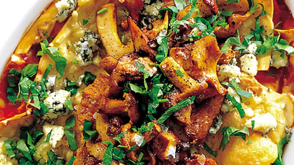1. Kantarellikastike: Hienonna toinen sipuleista ja paista se kantarellien kera voissa. Mausta suolalla ja pippurilla. Säästä muutama sieni koristeluun. Lisää sieni-sipuliseokseen paseeratut tomaatit, anna kiehua hiljalleen 10 minuuttia. Raasta juustot ja sekoita raasteet. Kuumenna uuni 200 asteeseen.