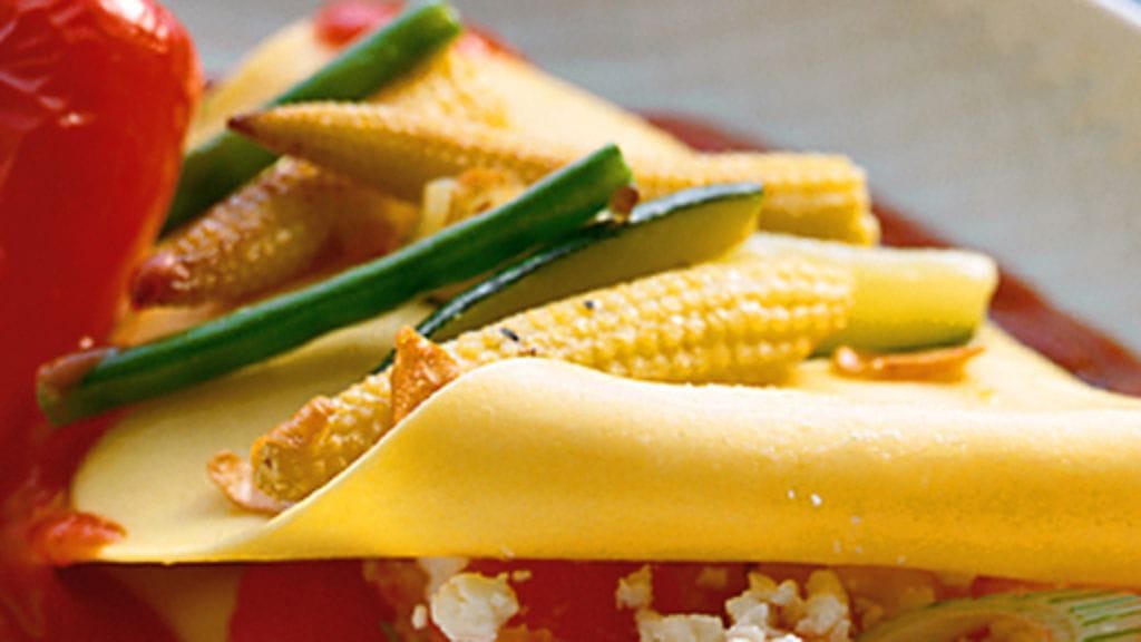 3. Keitä lasagnelevyt al dente kevyesti suolatussa vedessä. Levitä porkkanakreemi levyille täytteeksi, lisää ricottaa. Asettele kesäkurpitsa, minimaissit ja chili annosten päälle.
