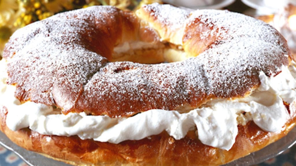 5. Työstä taikinaa jauhotetulla alustalla ja kaulitse pitkulaiseksi levyksi. Kääri se rullalle ja muotoile kranssiksi leivinpaperille pellille. Litistä sitä hieman ja nypi sauma yhteen.