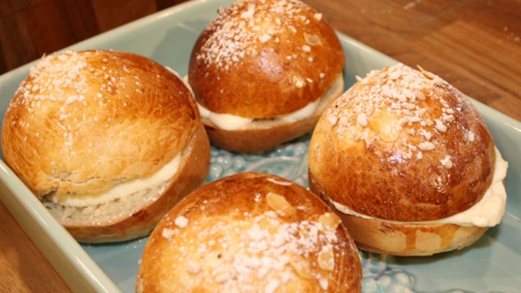 Täytä jäähtyneet pullat vadelmahillolla tai mantelimassalla ja kermavaahdolla.