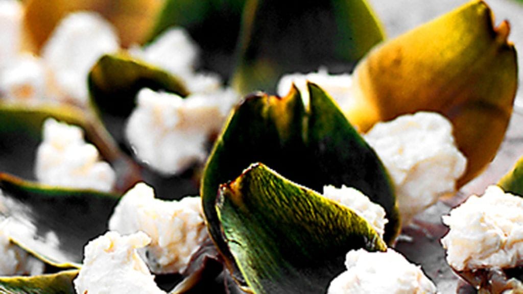 3. Kuumenna kevyesti suolattua vettä kiehuvaksi tilavassa kattilassa, lisää laakerinlehti ja sitruunalohko. Lisää artisokat, kuumenna kiehuvaksi ja alenna lämpöä. Keitä kannen alla n. 40 minuuttia. Kun lehdet irtoavat helposti, artisokat ovat valmiita. Irrota lehdet ja asettele ne tarjoiluvadille. Laita vuohenjuustotäytettä lehdille.