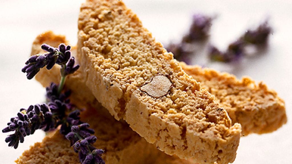 1. Kuumenna uuni 175 asteeseen. Jauha puolet manteleista, rouhi loput ja sekoita ne jauhojen, leivinjauheen ja laventelin kera.