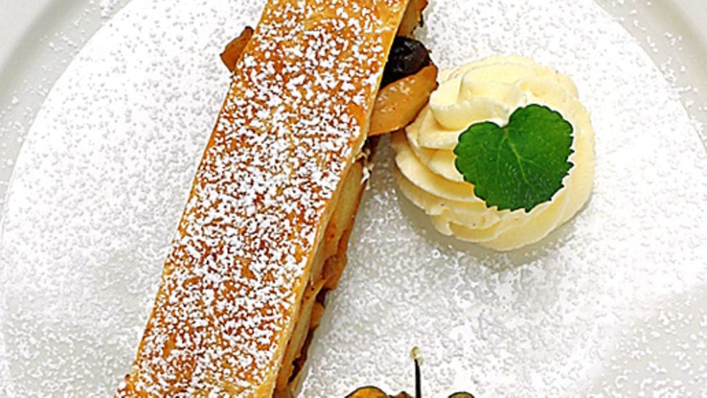 1. Kuumenna uuni 225 asteeseen. Kuori ja kuutioi omenat. Sulata voi ja sokeri paistinpannulla. Lisää omenakuutiot, raastettu sitruunankuori ja sitruunamehu. Hauduta välillä sekoittaen 10 minuuttia, kunnes omenat pehmenevät. Kastikkeen on tarkoitus olla paksua ja siirappimaista. Lisää kastikkeeseen muskottipähkinä, kaneli ja rusinat. Anna jäähtyä.