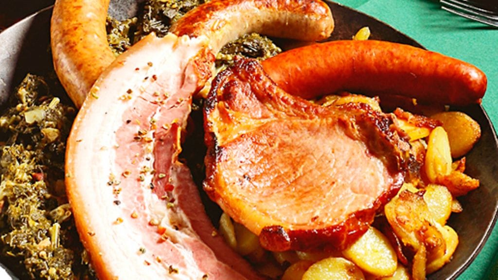 3. Lisää kaurahiutaleet kaaliin niin että padasta tulee paksumpi. Mausta suolalla, pippurilla, sinapilla ja sokerilla. Lisää lihat ja asettele makkarat päällimmäiseksi. Tarjoile paistettujen perunoiden kera.