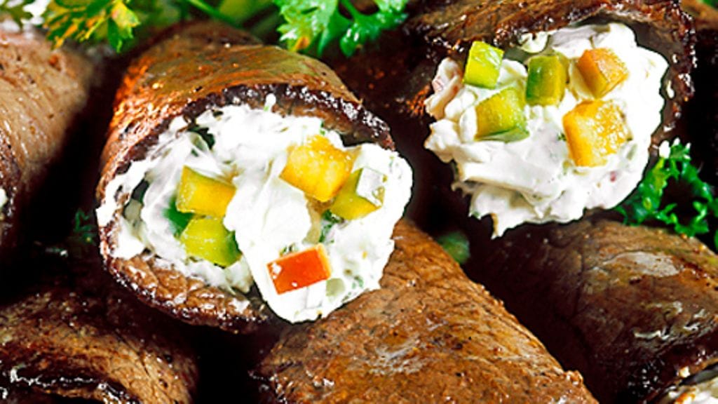 2. Mausta pihvit, paista ne molemmilta puolilta. Jaa täyte pihveille, kääri rullalle ja tarjoile.
