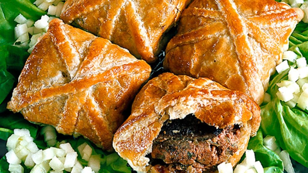 3. Aseta pihvit voitaikinalevylle ja kääri pakettiin. Käännä saumakohta alaspäin ja nosta leivinpaperille uunipellille. Koristele taikinanauhoilla ja penslaa paketit vatkatulla munalla. Paista noin 20 minuuttia uunissa.