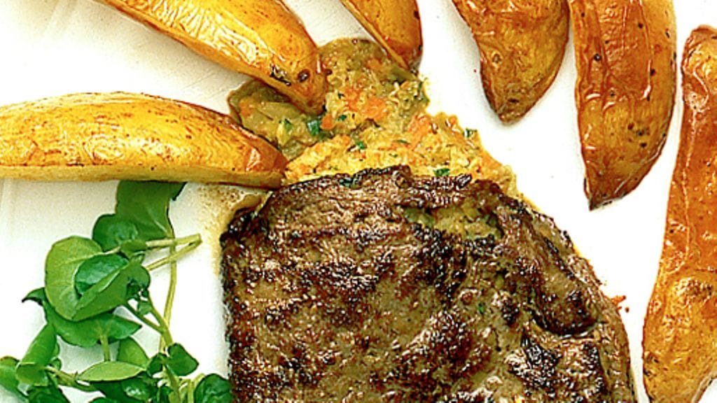 3. Levitä seos pihveille. Taita pihvit kaksinkerroin, paista vajaa minuutti kummaltakin puolelta. Tarjoile lohkoperunoiden kera.