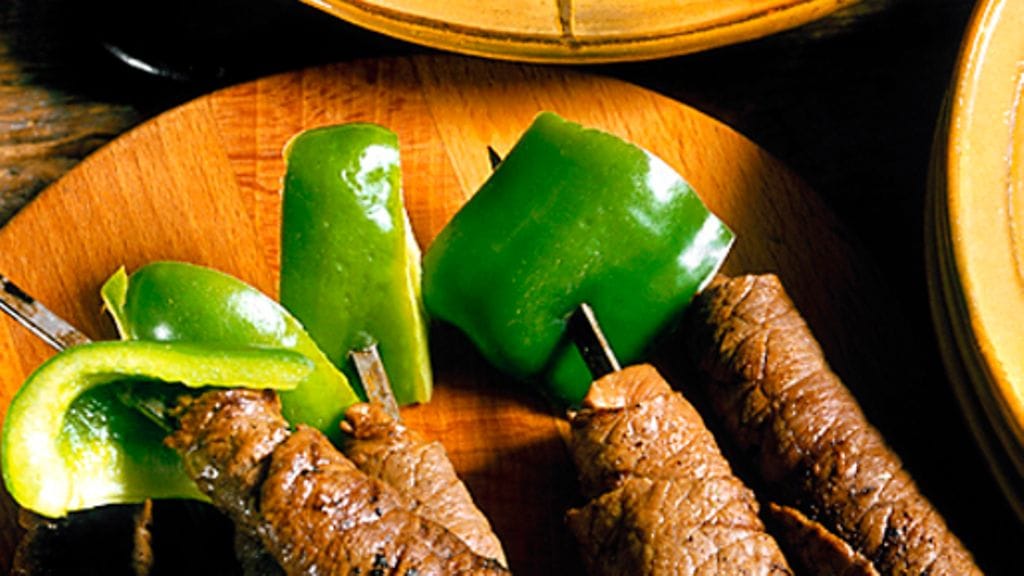 5. Halutessasi voit grillata paprikaa vartaiden päissä. Tarjoile salaatin kera, johon laitat viipaloituja tomaatteja ja nippusipulia sekä sinappivinaigrettea.
