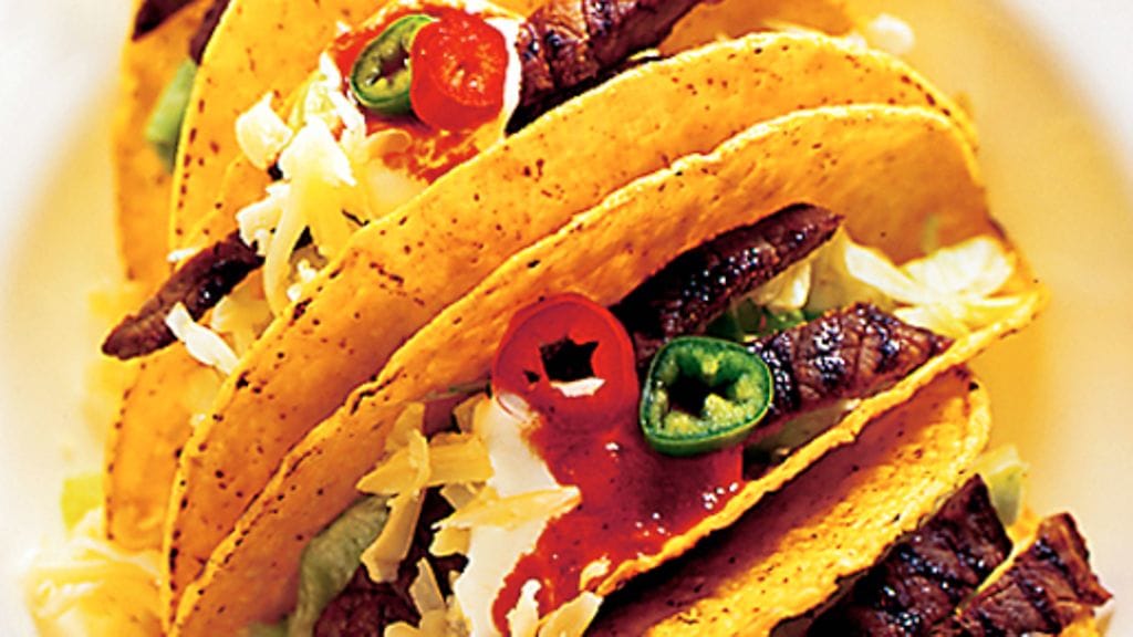 3. Täytä tacokuoret suikaloidulla salaatilla ja lihalla. Mausta guacamolella, jalopeñon viipaleilla ja tacokastikkeella.