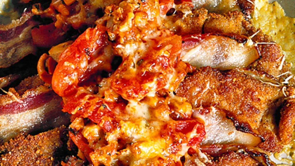 6. Laita joka leikkeelle pekoniviipale, levitä päälle tomaattikastike, ripottele päälle juustoraaste ja gratinoi uunissa kunnes juusto on sulanut.