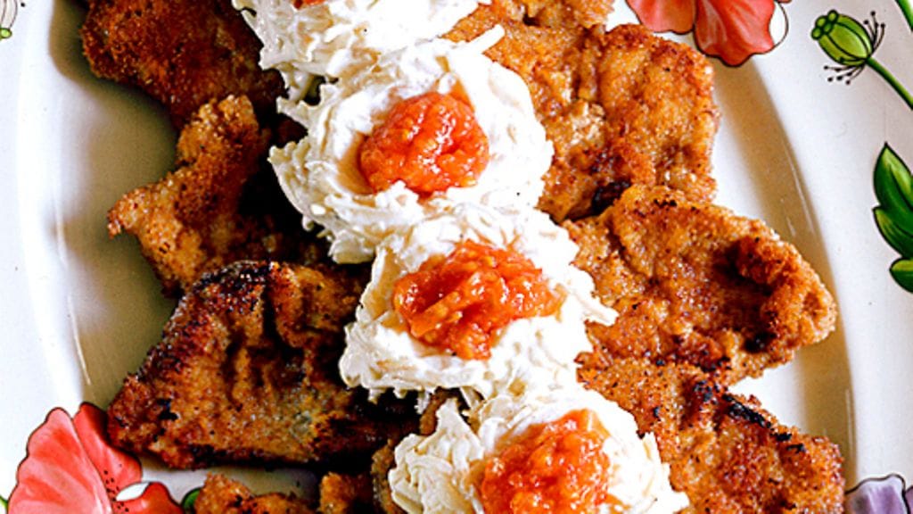 3. Nuiji tai painele nyrkillä porsaanleikkeitä litteämmiksi ja mausta ne. Kääntele ensin jauhossa, sitten munassa ja lopuksi korppujauhossa. Paista pannussa keskilämmöllä melko runsaassa rasvassa.