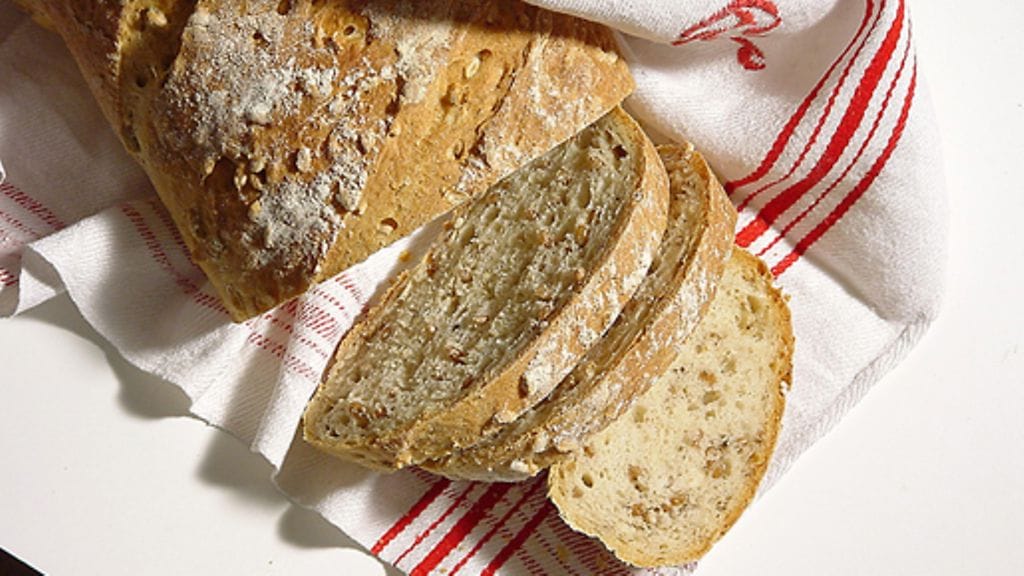 2. Liuota hiiva kädenlämpöiseen veteen ja lisää rapsiöljy, suola ja anis. Sekoita mukaan vehnänjyvät, kaurahiutaleet ja suurin osa vehnäjauhoista. Työstä voimakkaasti, 6 minuuttia monitoimikoneella tai 12 minuuttia käsin. Anna kohota liinan alla 45 minuuttia lähes kaksinkertaiseksi.