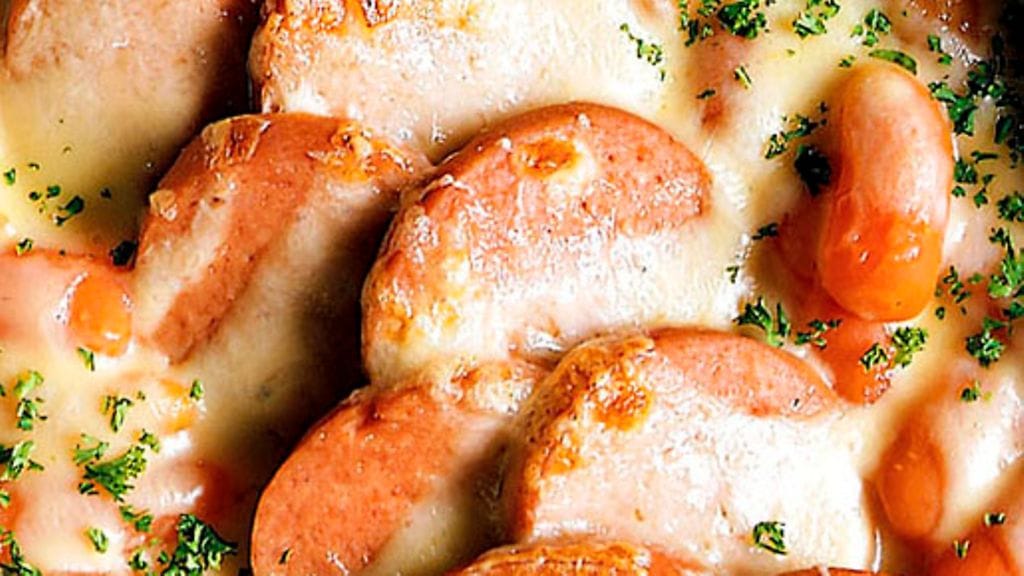 3. Nosta makkara kattilasta ja viipaloi. Laita viipaleet voideltuun uunivuokaan, asettele porkkanat ympärille. Kaada kastike vuokaan ja gratinoi 225-asteisessa uunissa 5 minuuttia.