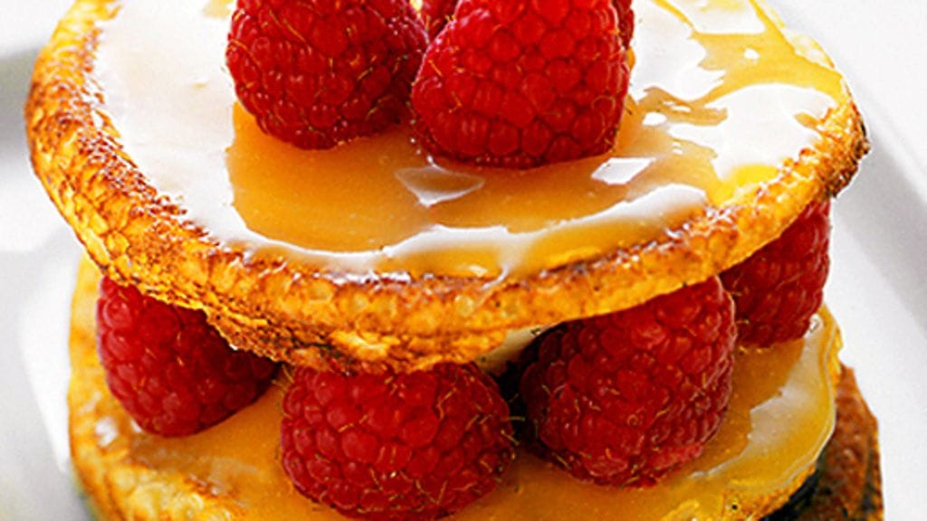 3. Kuumenna lettupannu ja laita pannuun hieman voita. Kaada ohut kerros taikinaa (n. ½ dl) jokaiseen lettuun. Kun pinta on jähmettynyt, on aika kääntää letut ja paistaa vielä muutama minuutti. Paista kaikki letut samalla tavalla. Tarjoile kolakastikkeen ja vadelmien kera.