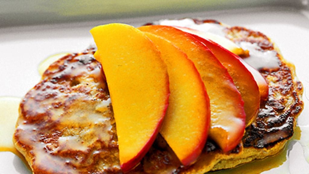 3. Halkaise nektariinit ja poista kivet. Lohko ne ohuesti. Tarjoile nektariinilohkot ja vaahterasiirappi lettujen kera.