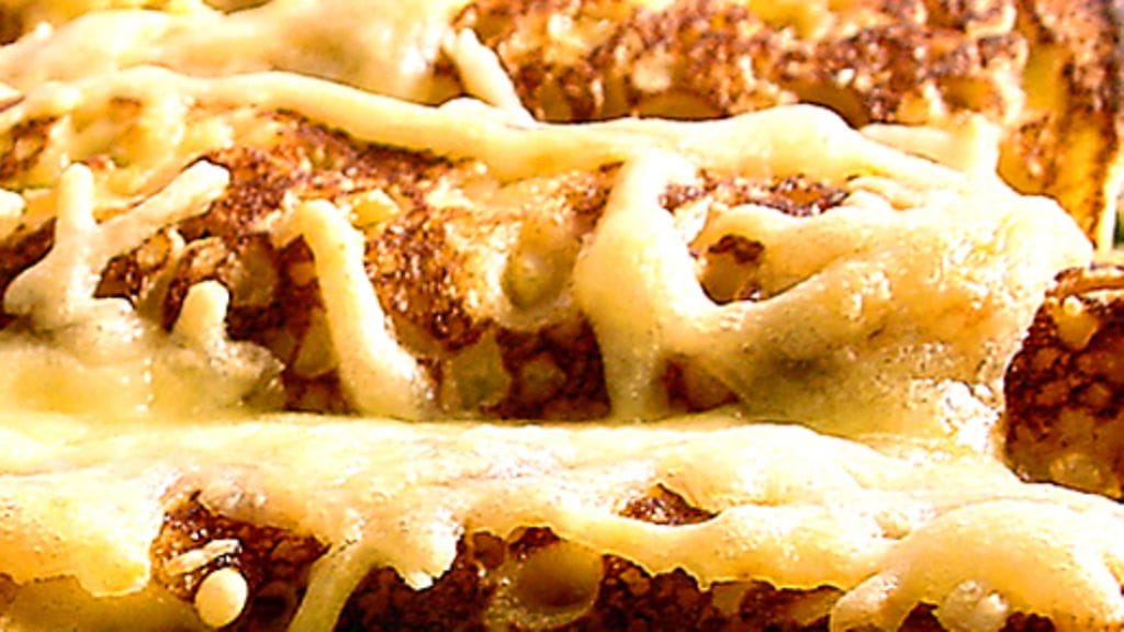 2. Jaa täyte ohukaisille ja kääri ne rulliksi. Aseta lettukääröt uunivuokaan sauma alapäin. Ripottele niiden päälle juustoraastetta.