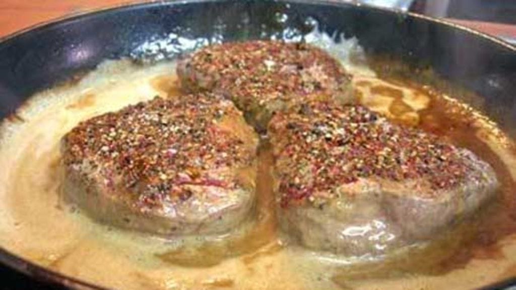 Leikkaa sisäfilee 150 g pihveiksi. Ota liha huoneenlämpöön hyvissä ajoin ennen paistamista. Mausta pihvit suolalla ja sivele pintaan sinappia. Paina pihvit pippurimurskaan. Ruskista voi pannulla ja laita pihvit paistumaan. Paista muutama minuutti per puoli. Vähennä lämpöä ja lisää pannulle konjakki. Sytytä alkoholi palamaan tulitikulla, pidä pannu pois kasvojen suunnasta isojen liekkien varalta. Kun tuli on sammunut, lisää pannulle demiglace-kastike. Hauduta pihvejä muutama minuutti ja lisää lopuksi kermavaahto pannulle. Jatka hauduttamista kunnes pihvit ovat halutun kypsyisiä.
