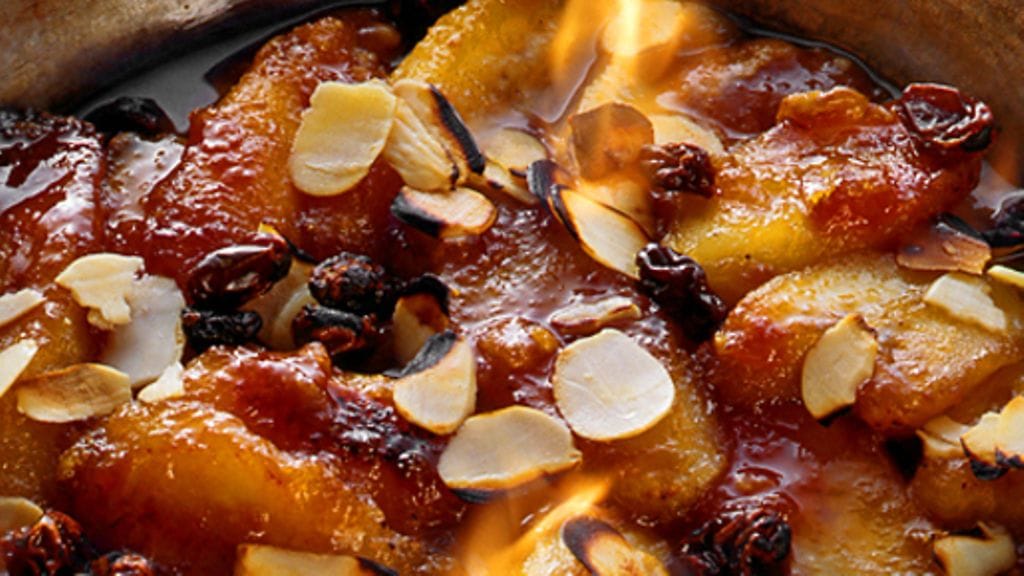 2. Laita banaanit pannuun ja paista ne sokeriliemessä pehmeiksi, 3-5 minuuttia. Lämmitä rommi kattilassa. Sammuta liesituuletin, kaada rommi pannuun. Sytytä se heti ja anna alkoholin palaa loppuun.