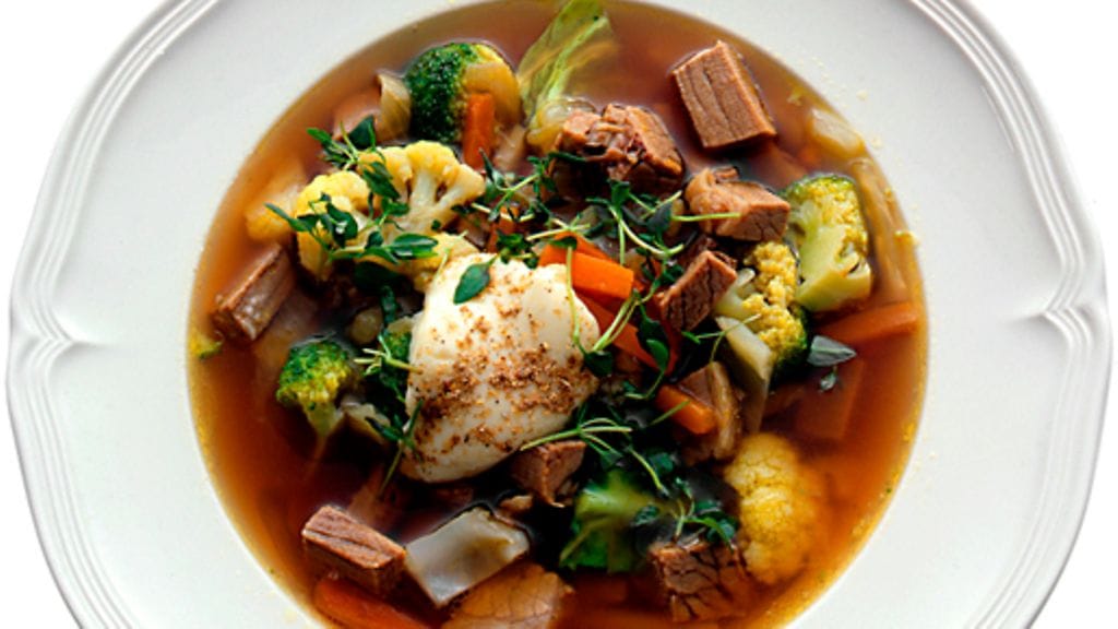 2. Kuori keltasipuli ja lohko se. Kuori porkkana ja paloittele. Puhdista purjo ja paloittele vihreä osa pienemmiksi paloiksi. Laita liha suureen pataan, lisää vihannekset ja kaada päälle vettä niin että ainekset peittyvät. Kuumenna kiehuvaksi, kuori vaahto. Lisää suola, valkopippurit ja laakerinlehti. Keitä kannen alla kunnes liha on mureaa, n. 1 ½ tuntia.