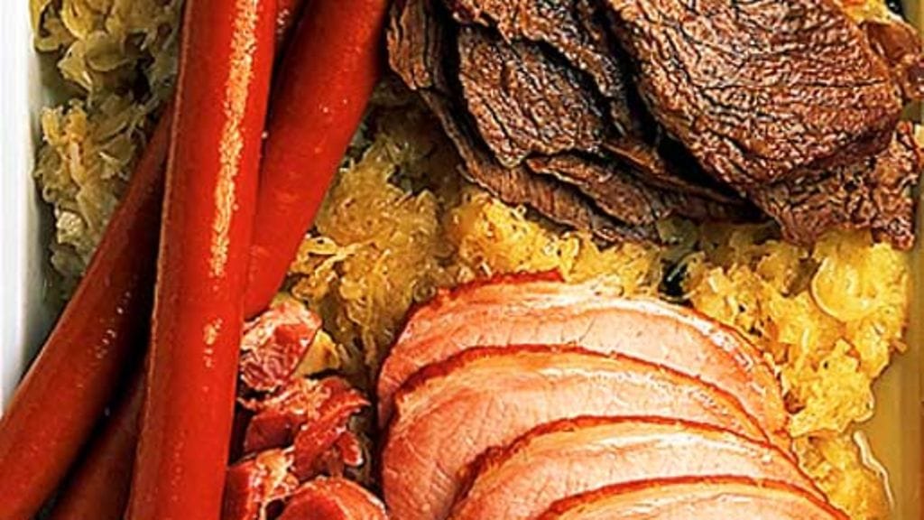 1. Kuori 3 keltasipulia ja lohko ne. Huuhtele sianpotka ja häränrinta kylmässä vedessä. Kuumenna vesi kiehuvaksi ja lisää lihat. Kuumenna jälleen kiehuvaksi ja kuori vaahto. Lisää sipulilohkot, pippurit ja laakerinlehdet. Anna kiehua n. 1 ½ tuntia kunnes lihat ovat mureita. Säästä liemi hapankaalia varten.