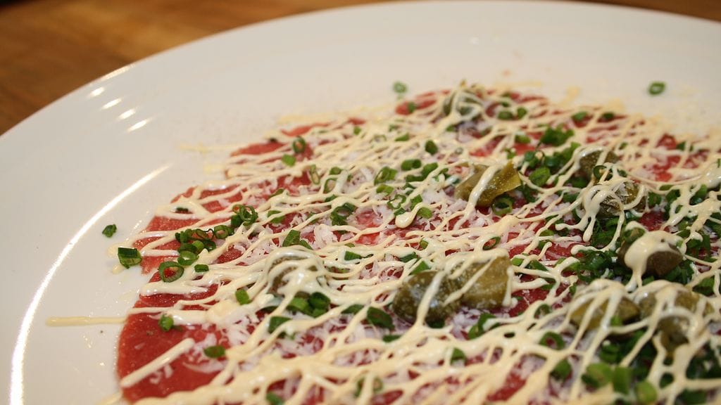 Sekoita majoneesi ja worchesterkastike kulhossa. Lusikoi majoneesi kertakäyttöiseen pursotinpussiin. Leikkaa pussin kärjestä pieni pala pois ja pursota carpaccion pinta raidalliseksi.