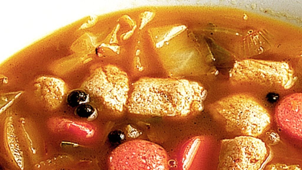 1. Leikkaa kaali 1½ x 1½ cm viipaleiksi. Kuori ja hienonna sipulit. Kuullota kaalit ja sipulit pienissä erissä rasvassa. Kaada isoon kattilaan, lisää liemi ja mausteet. Keitä 40 minuuttia.