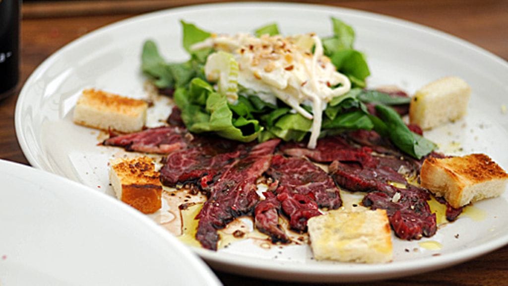 Levitä ruokalusikalliset balsamicoa ja oliiviöljyä lautasille ja pilko valkosipulia mukaan aivan pieninä kuutioina. Leikkaa liha paperinohuiksi siivuiksi ja levitä etikkaöljyn päälle. Sivele pinnalle lisää öljyä ja etikkaa. Rouhi päälle pippuria ja ripaus suolaa. Tarjoa vihreän rucola-basilika-salaatin ja Waldorfin salaatin kanssa.
