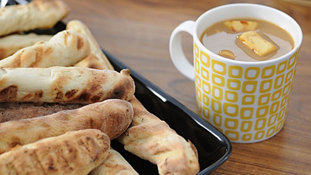 Kun taikina on noussut kaksinkertaiseksi, pyöräytä siitä noin kymmensenttisiä, sentin paksuisia tankoja ja grillaa ne kypsiksi miedolla lämmöllä, pari kertaa kääntäen.