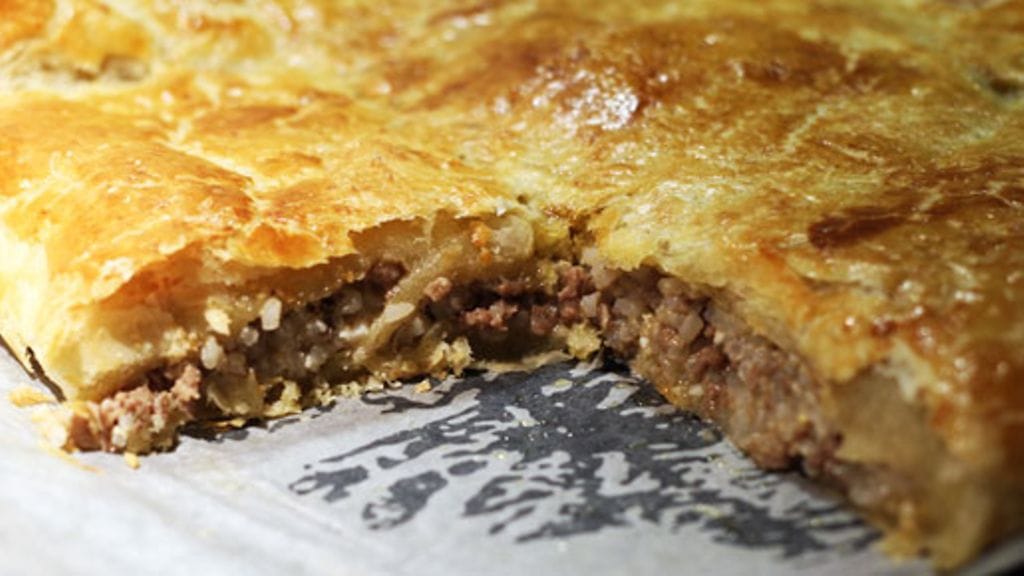 5) Sekoita kypsän riisin joukkoon jauhelihaseos ja hienonnettu kanamuna. Mausta seos paprikalla sekä musta-, valko- ja cayennepippurilla. Maista ja mausta (tuplasin sen jälkeen mausteet). Älä maista enää. Seis. Täytettä täytyy jäädä piirakkaankin.