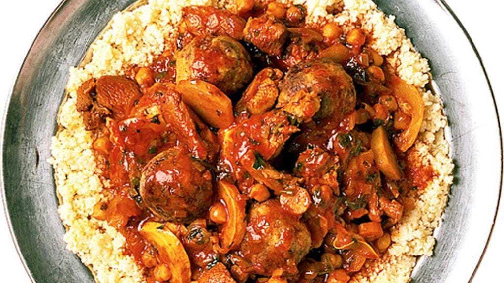 3. Kiehauta vesi ja lisää couscous, mausta suolalla. Anna ryynien vetäytyä 5 minuuttia. Sekoita voi couscousiin ja möyhennä haarukalla ennen tarjoilua. Lisää lihapullat, kikherneet ja tuore minttu kastikkeeseen ja keitä vielä 2 minuuttia. Levitä couscous isolle vadille ja nosta päälle lihapyörykät ja vihannekset. Kaada päälle hieman kastiketta ja tarjoile loppu kastike erillisestä kulhosta.