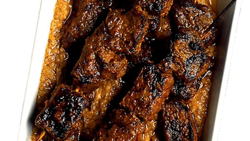 1. Leikkaa liha 2 cm:n kuutioiksi. Sekoita marinadi. Kun kaikki sokeri on liuennut, pane lihat marinoitumaan. Anna marinoitua viileässä vähintään tunti, välillä lihaa kääntäen.