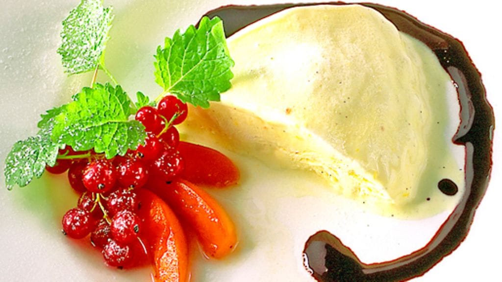 4. Kumoa jäädyke tarjoiluvadille. Koristele aprikooseilla ja marjoilla sekä tarjoa lisänä suklaakastiketta.