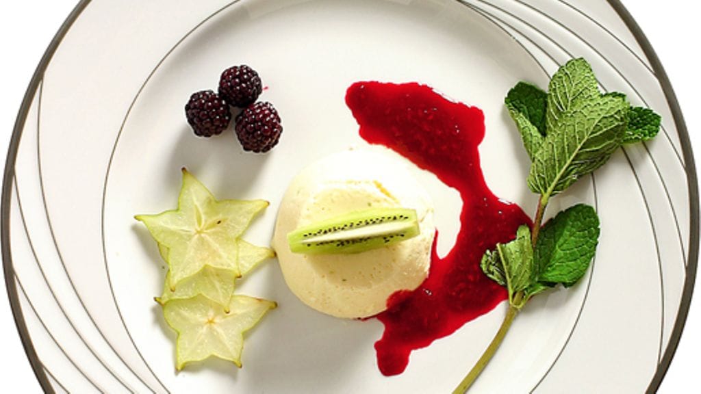 3. Kaada vaahto 4 pieneen annosvuokaan ja pane vuoat kylmään 4 tunniksi. Tarjoa suoraan vuoista tai kumoa lautaselle. Koristele karhunvatukoilla ja sitruunamelissalla.