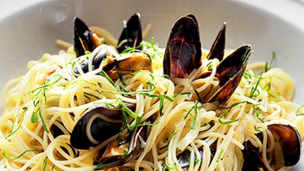 3. Kaada melkein kypsä pasta simpukkakattilaan, sulje kansi ja keitä, kunnes pasta on valmista. Lisää kattilaan puolet persiljasilpusta ja ravista. Kaada pasta ja simpukat isolle vadille. Ripota loppu persilja pinnalle ja tarjoile heti.