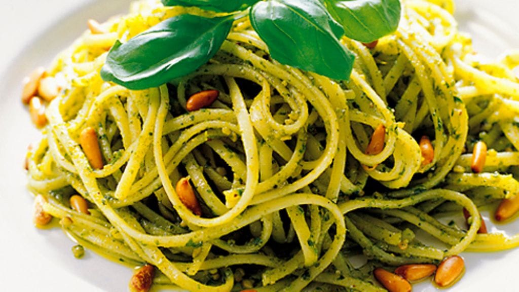 3. Sekoita pasta ja pesto ja ripottele päälle paahdetut pinjansiemenet. Tarjoa heti.