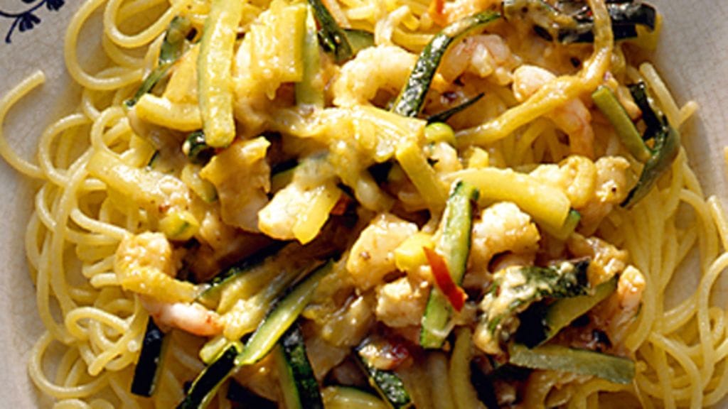 1. Kuori katkaravut, suikaloi kesäkurpitsa. Keitä pasta al dente runsaasti suolatussa vedessä. Hienonna valkosipuli, persilja ja chili.