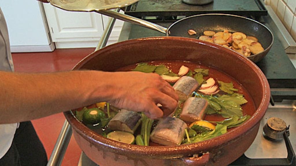 7. Mausta liemi voimakkaasti suolalla ja laita kalarullat hetkeksi liemeen kuumenemaan.
