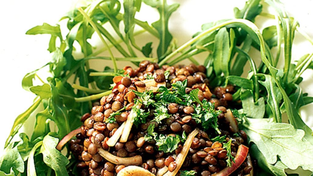 3. Levitä linssiseos rucolanlehtien päälle ja koristele hienonnetulla persiljalla.