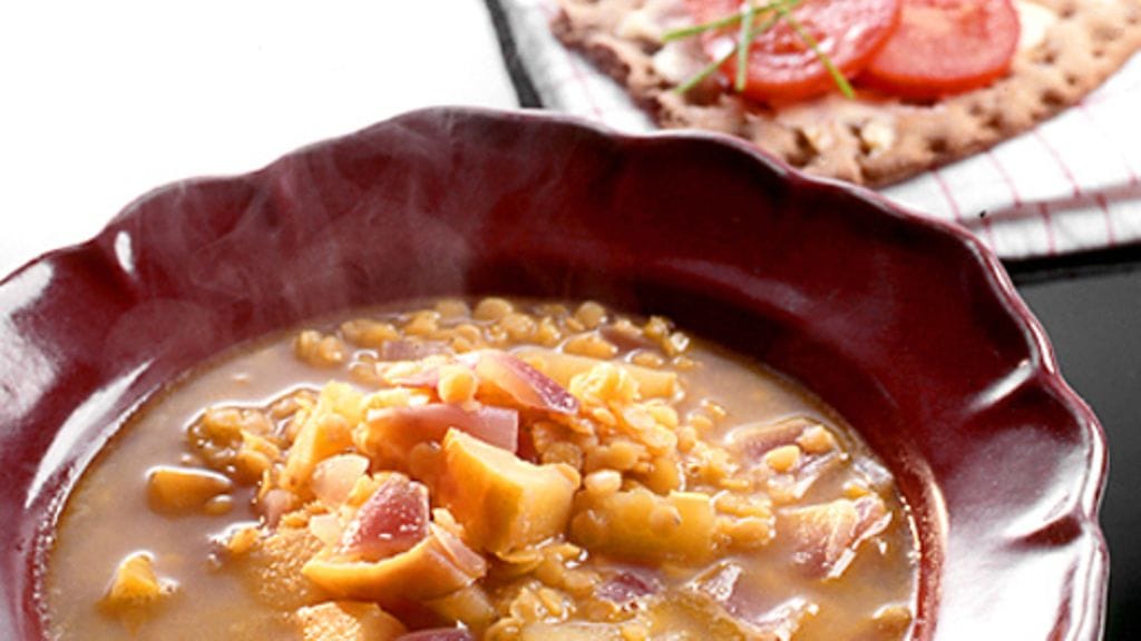 4. Keitto on valmis kun linssit ovat pehmenneet. Mausta suolalla ja pippurilla. Tarjoile näkkileipävoileivän kera.