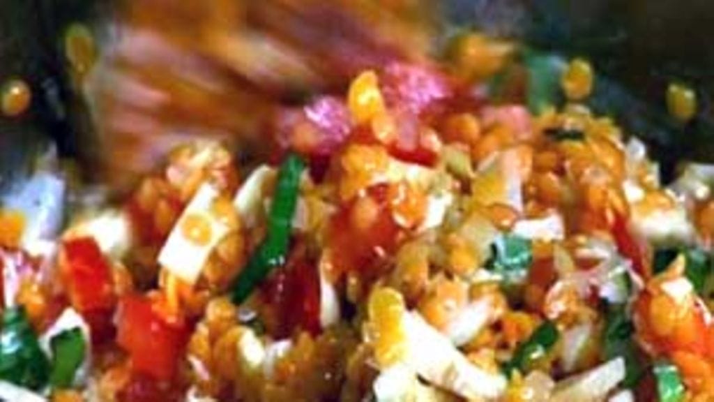 Kuumenna oliiviöljy isossa padassa ja kuullota sipulit. Lisää linssit ja sekoita. Lisää liemi, mausta suolalla ja pippurilla. Paista 200-asteisessa uunissa tunti. Jäähdytä seos huoneenlämpöiseksi. Pilko tomaatit ja latva-artisokan sydämet. Yhdistä kaikki aineet keskenään. Tarkista maku.