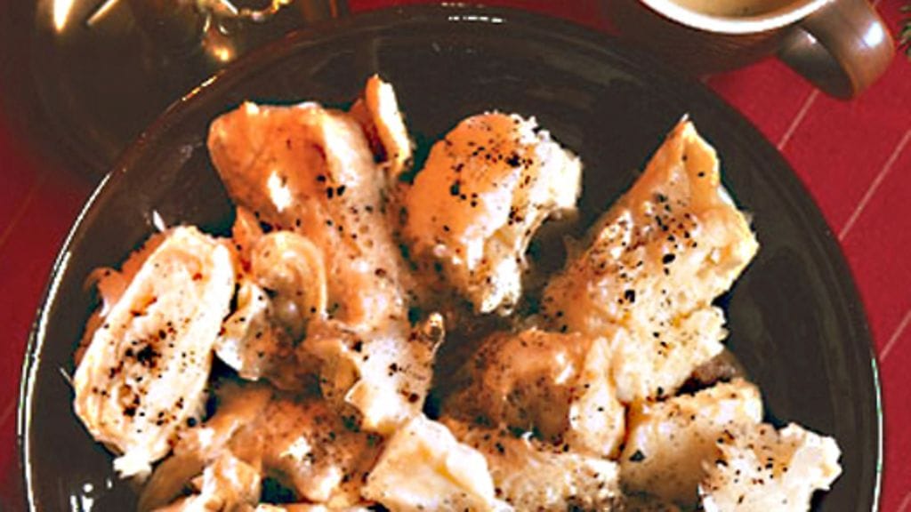 3. Kaada kalasta liemi pois ja mausta maustepippurilla. Tarjoile kastikkeen ja herneiden kera.