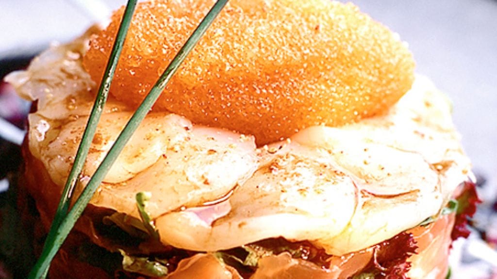 3. Viipaloi kampasimpukat paperinohuesti. Laita ne päällimmäiseksi lautasille ja penslaa lopulla kastikkeella. Laita kylmään hetkeksi.