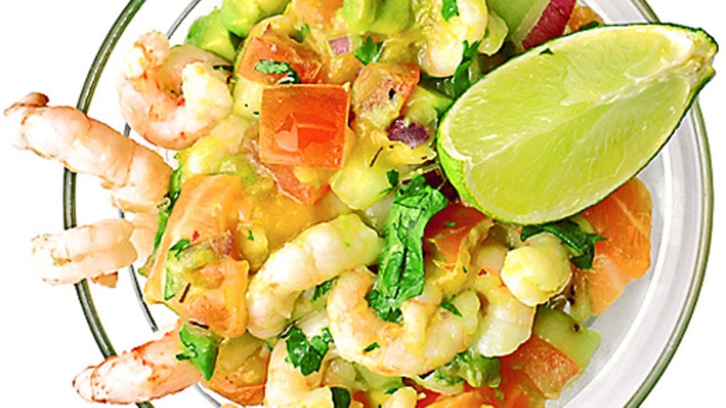 2. Sekoita kasvis- hedelmäkuutiot, salaattisuikaleet sekä katkarapu- ja lohikuutiot. Kaada päälle limettimehua ja mausta korianterilla.