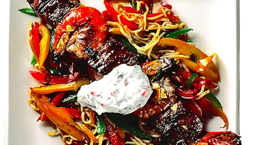 2. Perkaa ja suikaloi salaattisipulit, paprikat ja kesäkurpitsa. Keitä nuudelit pakkauksen ohjeen mukaan. Valuta ja siirrä sivuun. Leikkaa lohi 3 sentin kuutioiksi. Poista katkaravuilta pää, mutta jätä kuori paikoilleen. Pujottele vuorotellen lohta ja katkarapuja vartaisiin ja penslaa ne soijalla ja öljyllä.