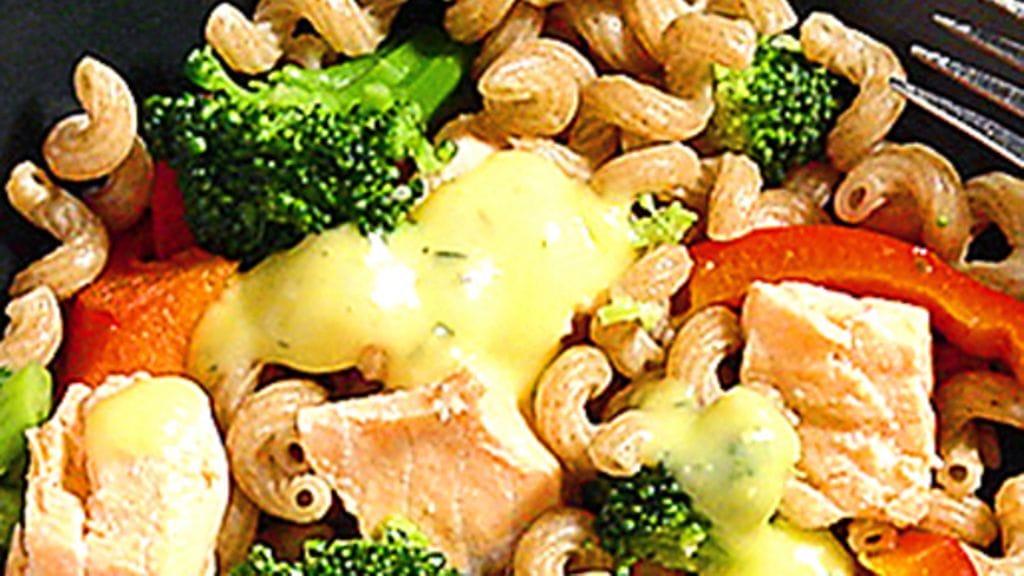 3. Sitruunakastike: Vatkaa vehnäjauhot ja tilkka lohilientä. Lisää loput liemestä (yhteensä 2 dl) ja kuumenna kiehuvaksi. Keitä muutama minuutti. Ota kattila liedeltä ja lisää suikaloitu sitruunankuori, sitruunamehu sekä rakuuna. Lisää keltuainen. Asettele lohipaloja pastasalaatin päälle, viimeistele kastikkeella.