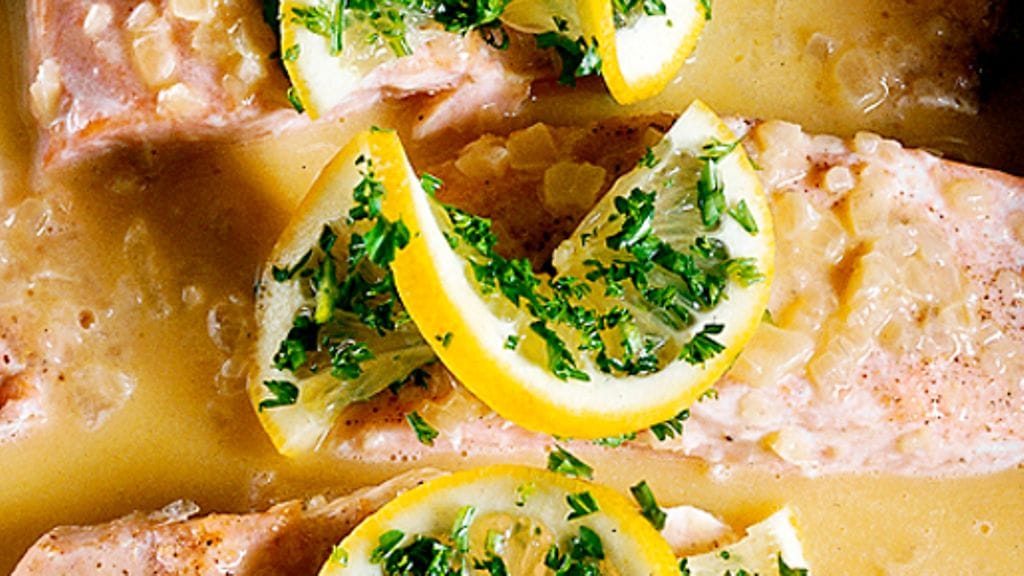 5. Kuumenna kastike, ota kasariliedeltä ja vatkaa voi joukkoon pieninä nokareina. Kaada kastike kalapalojen päälle, koristele sitruunaviipaleilla, jotka on kieritetty persiljasilpussa. Tarjoile keitettyjen perunoiden kanssa.