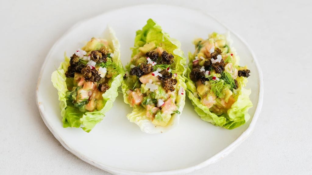 Leikkaa lohi 1 x 1cm:n kuutioiksi ja laita kulhoon. Säästä muutamia korianterin lehtiä koristeluun, hienonna loput varsineen ja yhdistä loheen. Hienonna punasipuli ja sekoita sekin lohen joukkoon.