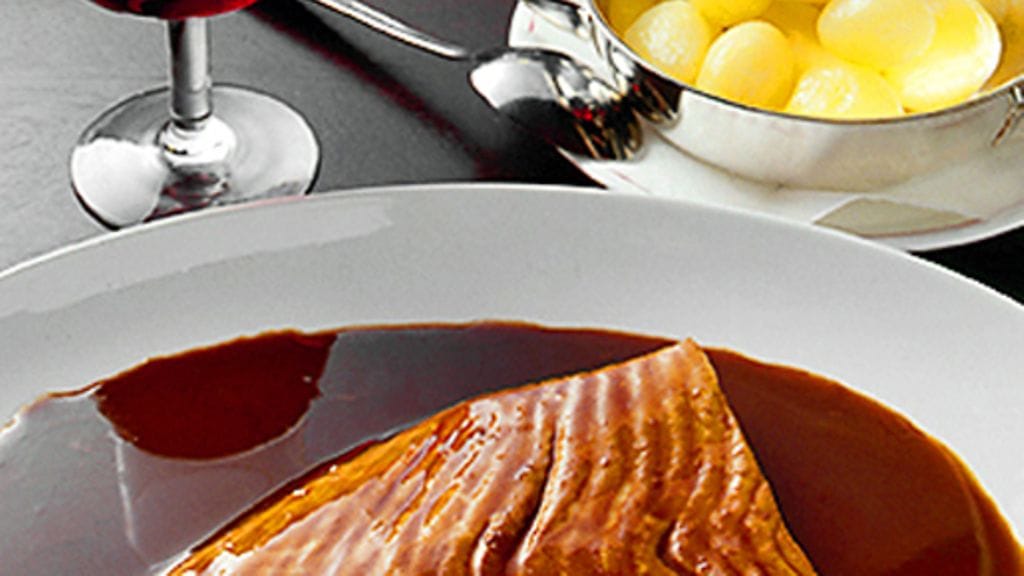 2. Punaviinikastike: Kuori ja silppua sipuli. Kuumenna kasarissa voita ja kuullota sipulisilppua kullankeltaiseksi. Nosta pois liedeltä ja sekoita joukkoon jauho. Lisää punaviini ja lihaliemi sekoittaen. Nosta kasari takaisin liedelle, kuumenna kiehuvaksi, laske lämpöä ja hauduta 3 minuuttia. Siivilöi sitten tiuhan siivilän läpi.