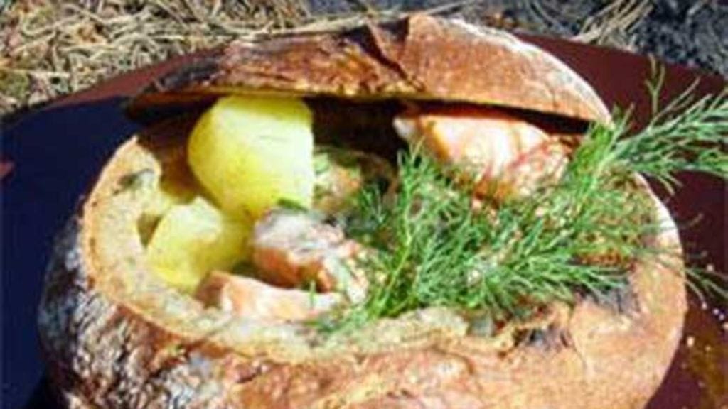 Koverra leivät kupeiksi ja paahda niitä useasti käännellen kunnes ne alkavat kuivua. Leikkaa sisäosan palat pikku kuutioiksi ja kuivata myös ne grillissä. Voit tarjota leipäkrutongit keiton kanssa tai jauhaa niistä korppujauhoja. Tarjoa keitto lämpöisistä leipäkupeista.