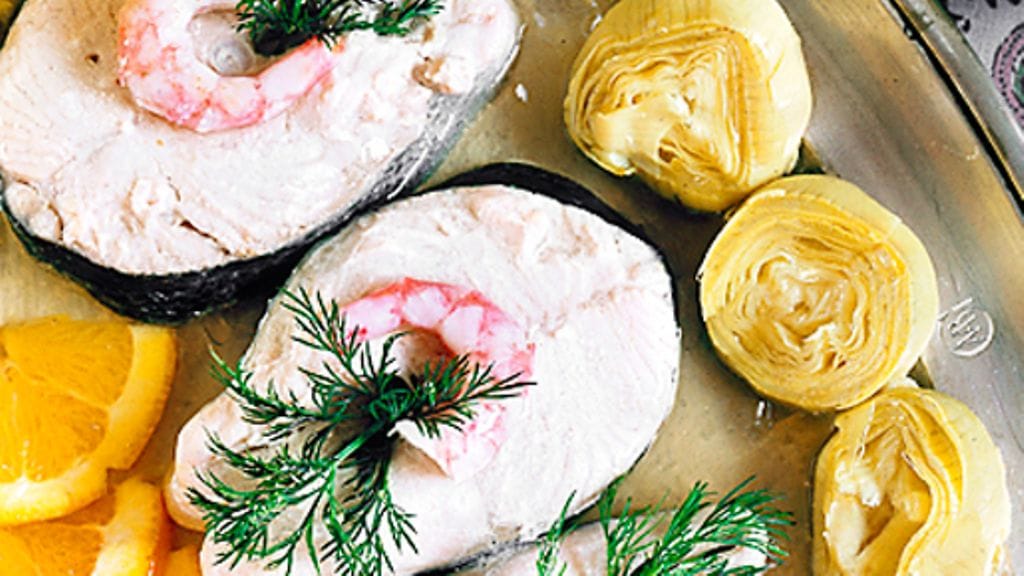 4. Nosta kyljykset liemestä ja asettele ne tarjoiluvadille kauniisti yhdessä parsan, appelsiiniviipaleiden, katkarapujen ja artisokanpohjien kanssa.